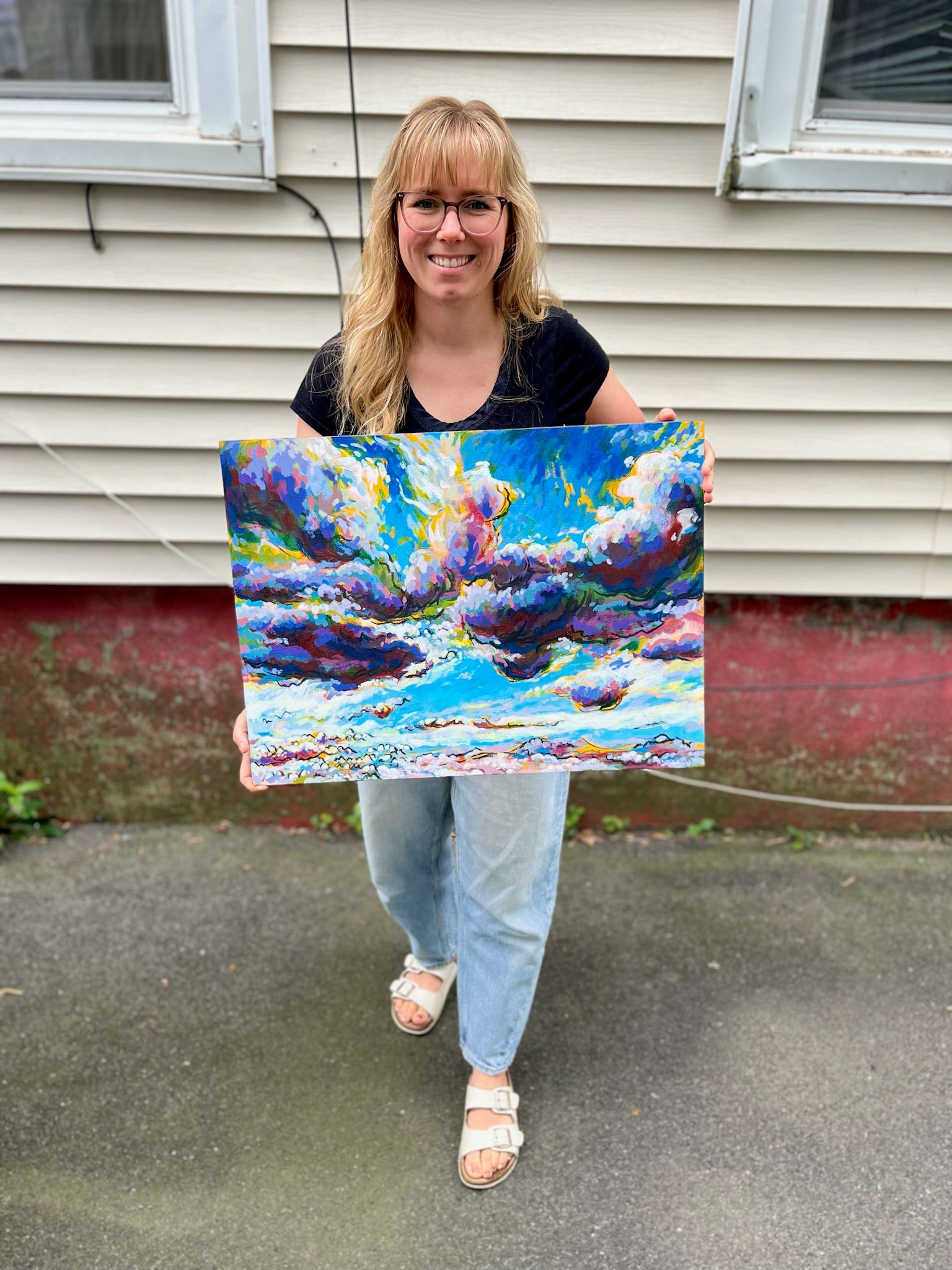 An original painting by Lauren Miller in 2020, inspired by dramatic afternoon clouds. Made with acrylic, pastel, and charcoal on gessoed wood panel, size 18”x24x1.5”.