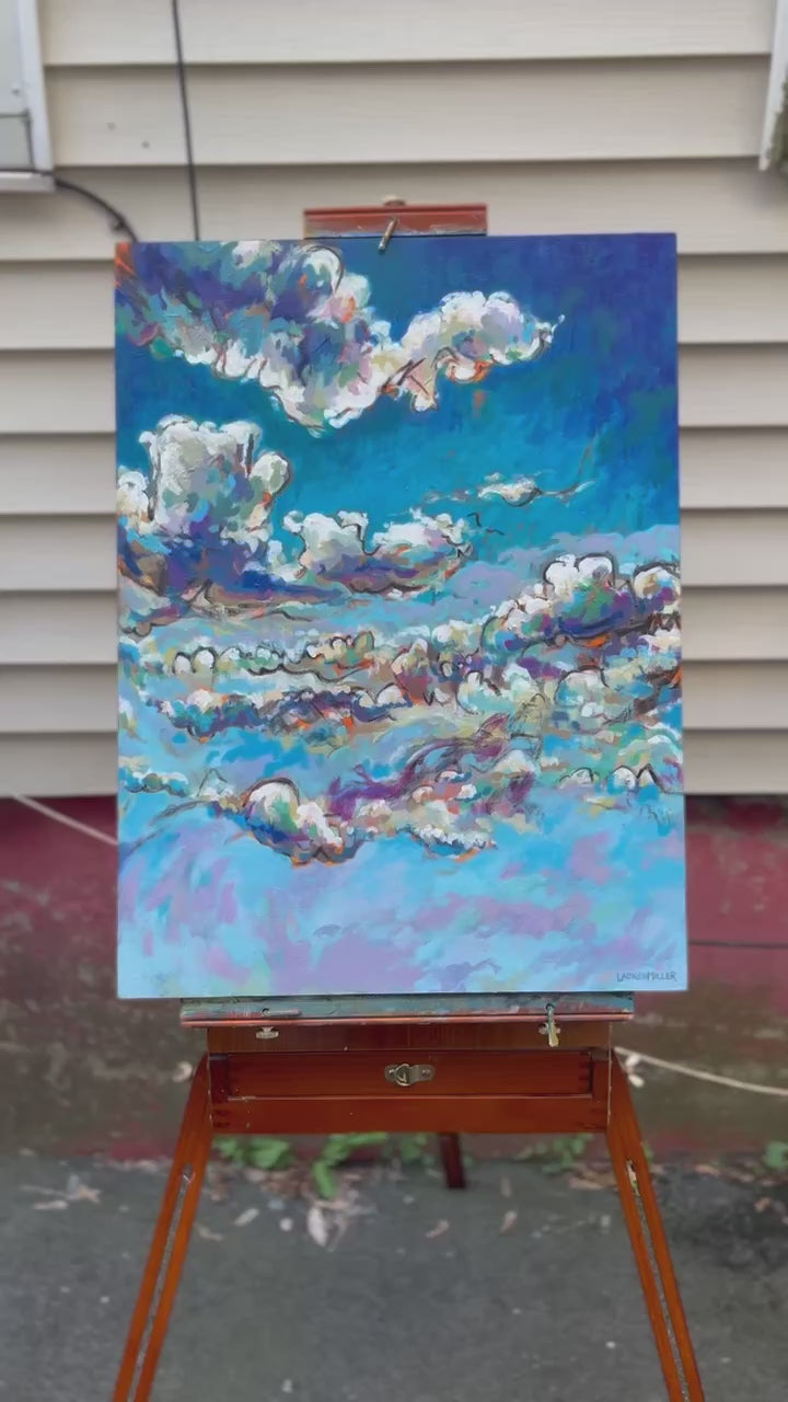 An original painting by Lauren Miller in 2020, inspired by summer clouds at midday. Made with acrylic, pastel, and charcoal on gessoed wood panel, size 18”x24x1.5”. The painting will arrive packaged in bubble wrap and wrapped in cardboard for safety.