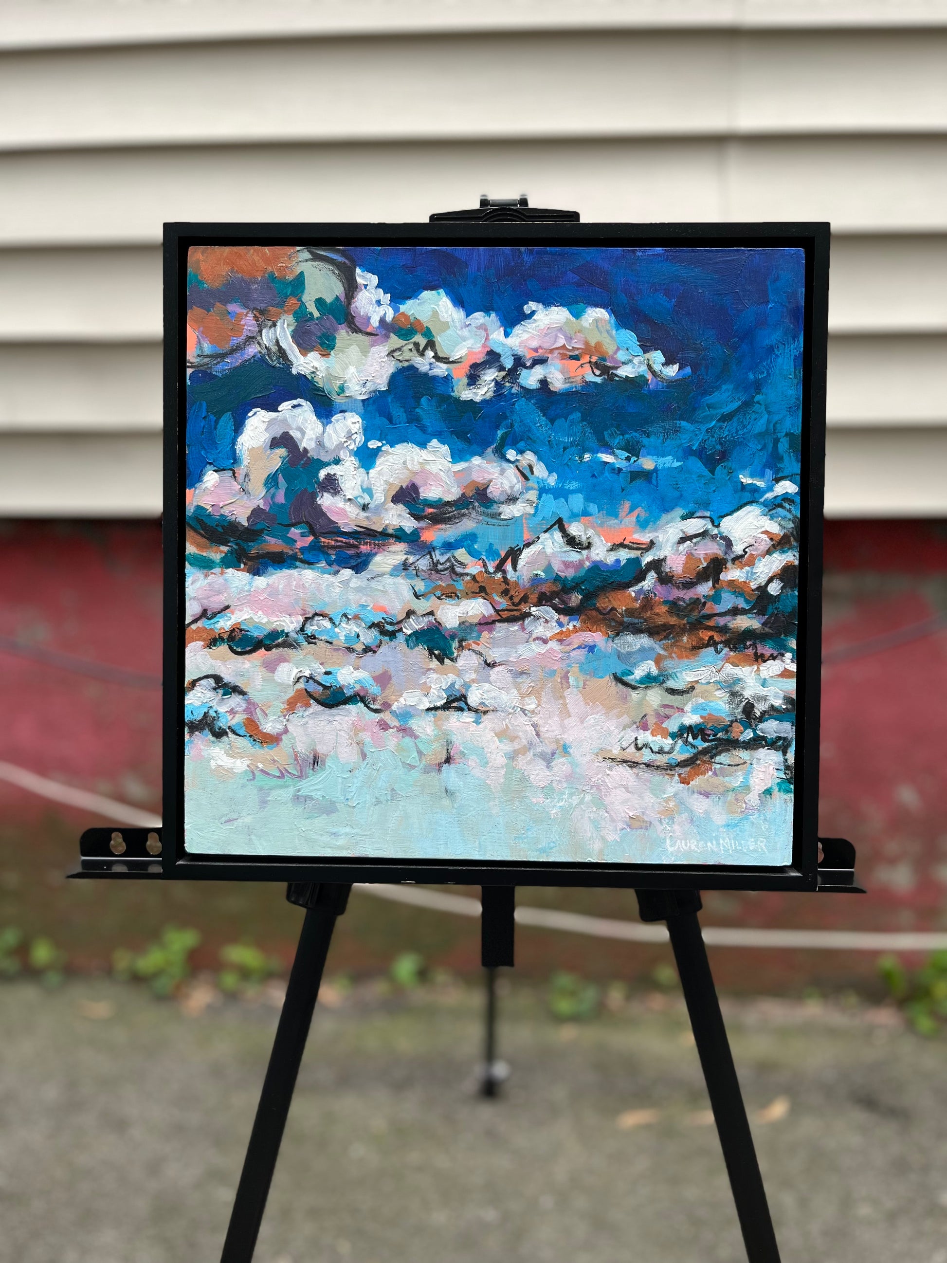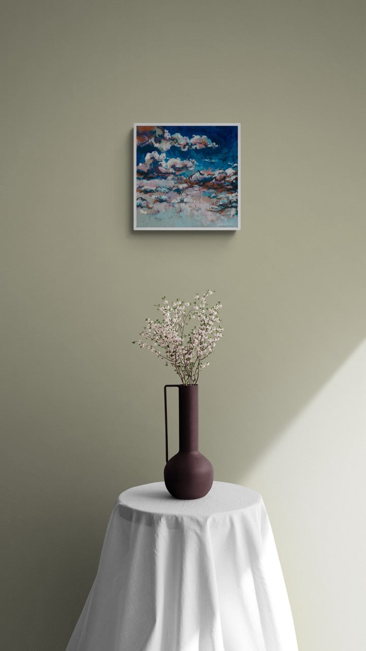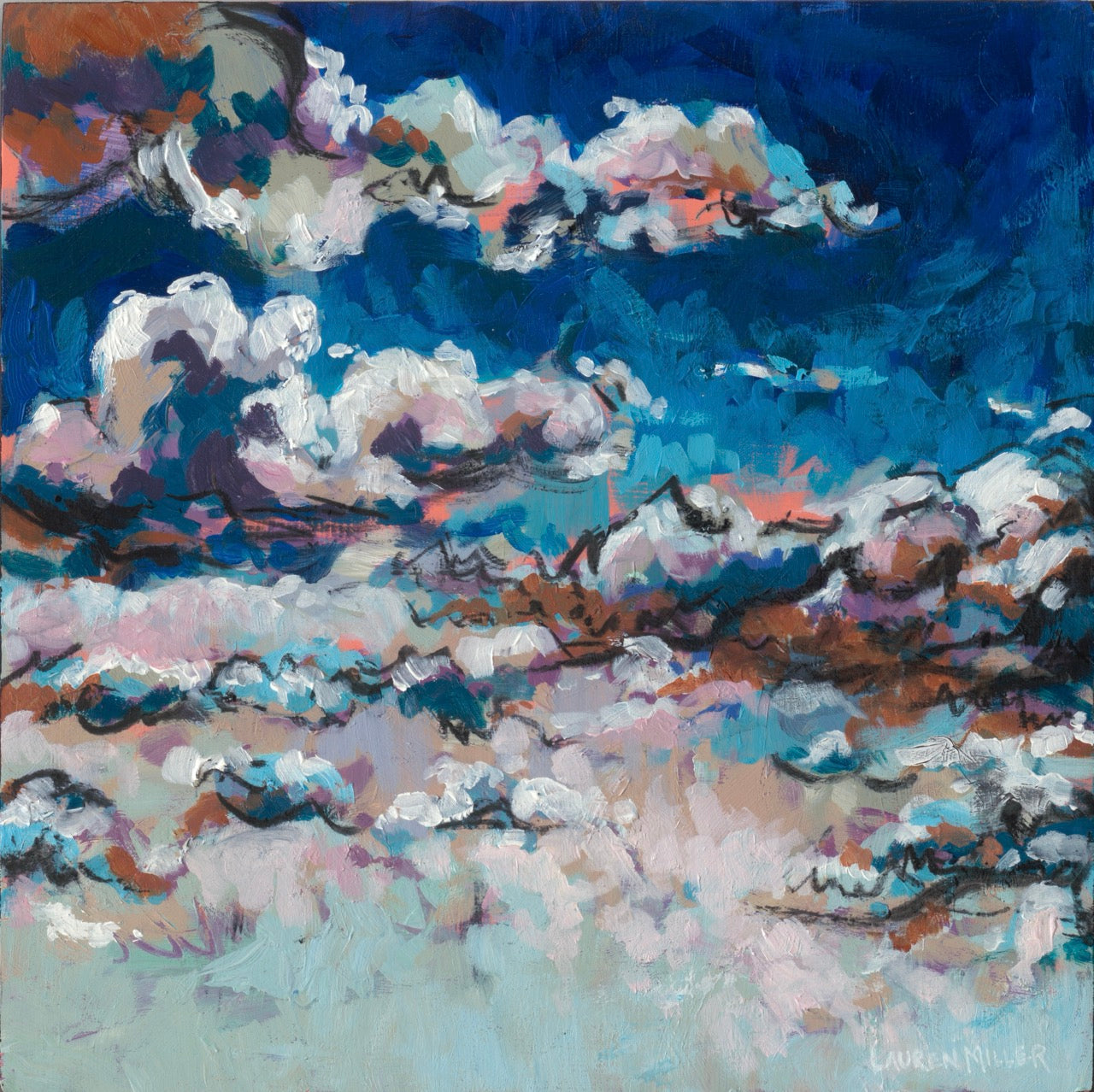 An original painting by Lauren Miller, depicting abstracted summer clouds. Made with acrylic, pastel, and charcoal on gessoed wood panel, size 12”x12x1”. The painting will arrive packaged in bubble wrap and wrapped in cardboard for safety. Acrylic and charcoal on wood, 12”x12”.