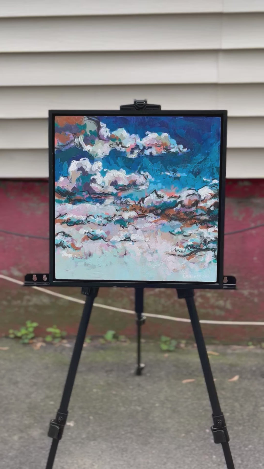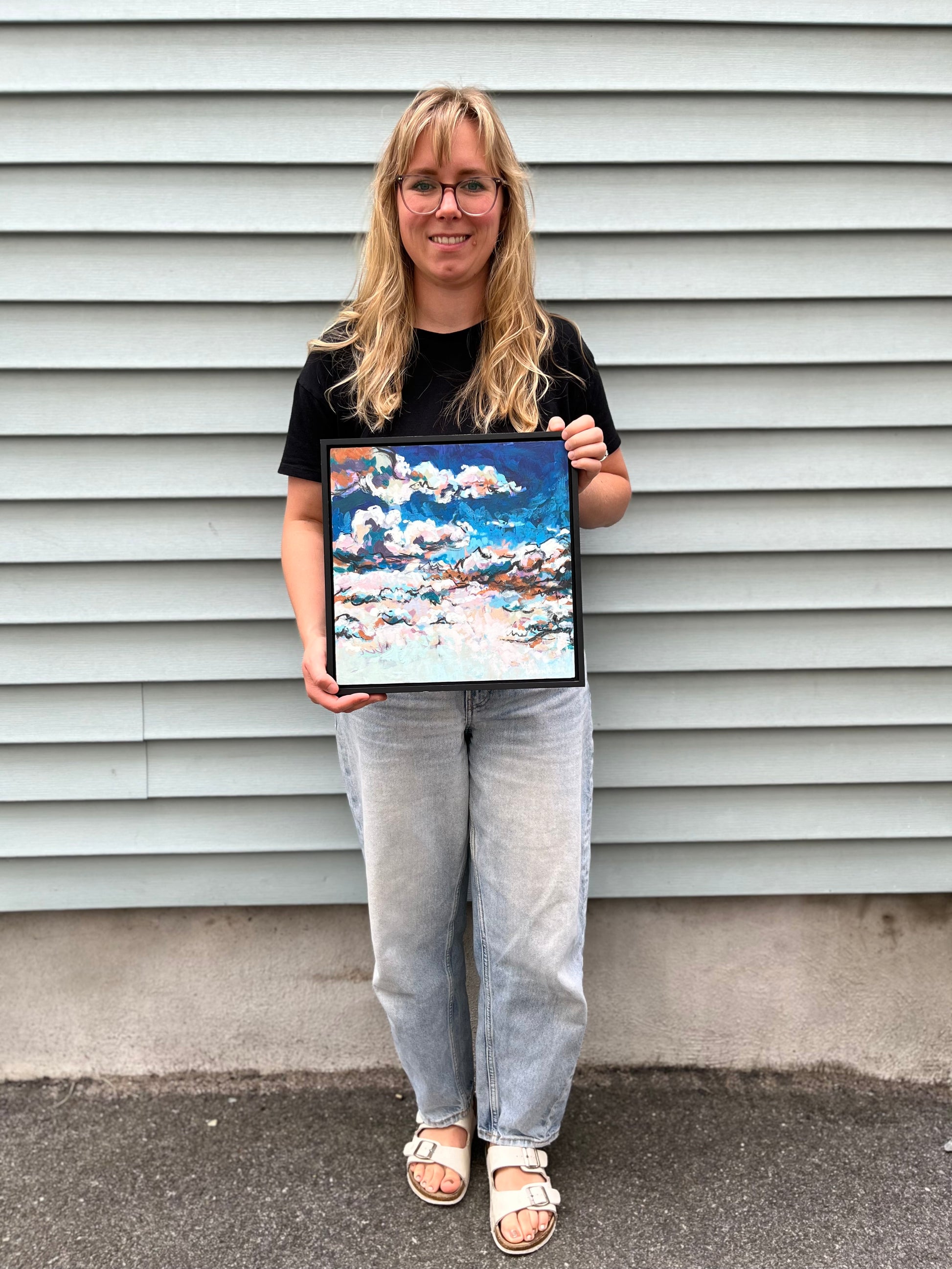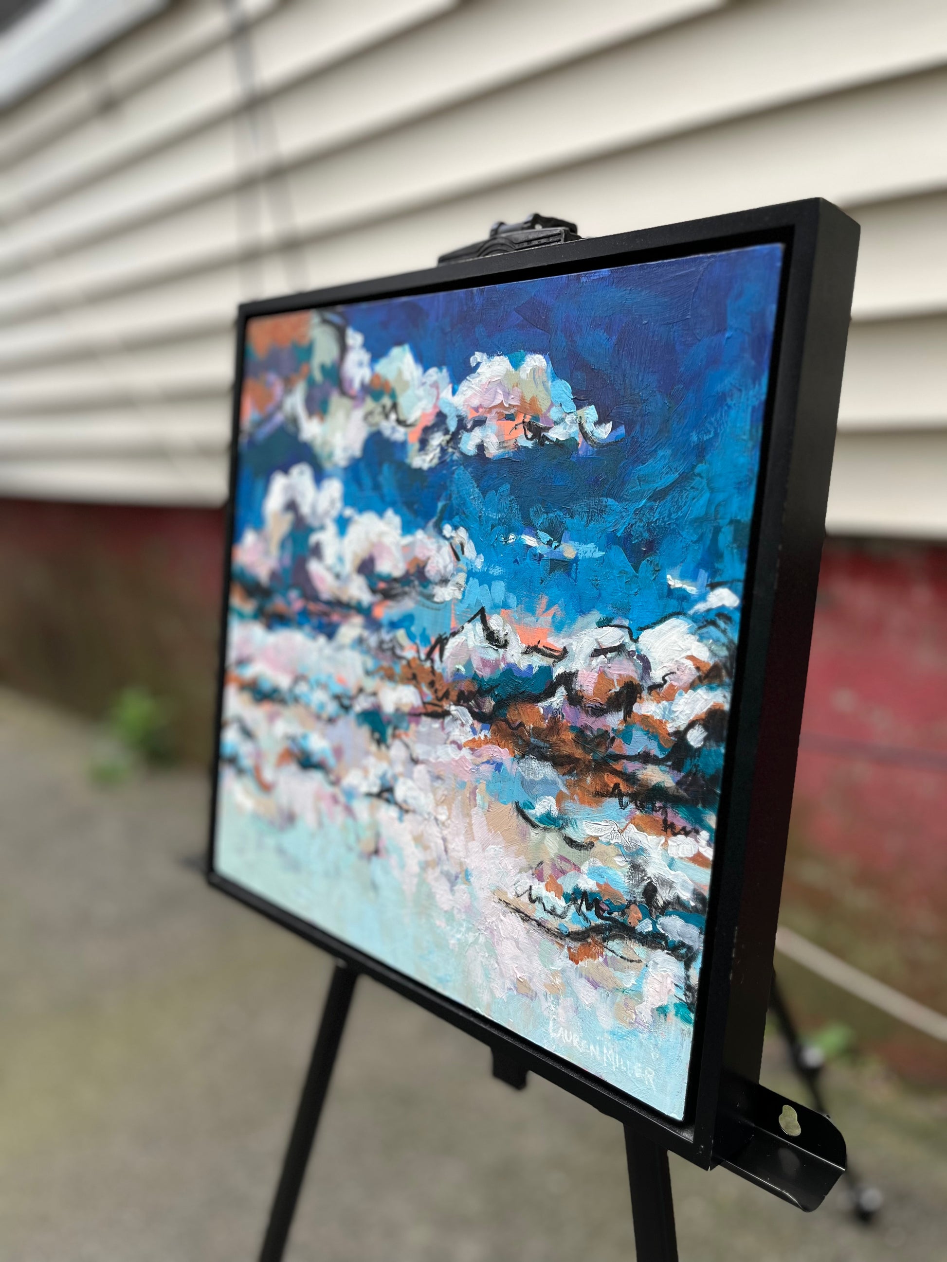 An original painting by Lauren Miller, depicting abstracted summer clouds. Made with acrylic, pastel, and charcoal on gessoed wood panel, size 12”x12x1”. The painting will arrive packaged in bubble wrap and wrapped in cardboard for safety. Acrylic and charcoal on wood, 12”x12”.
